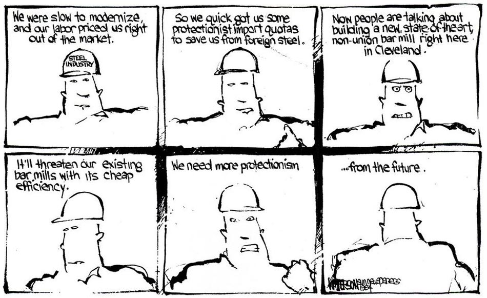 As a political cartoonist for the Cincinnati Post in the early 1980s, Watterson quickly discovered that he knew too little about the subject matter. He was out of touch with Cincinnati's local politics. He also found out that his editors had no ears for his artistic ambitions and demands. As a result, Watterson was predictably fired... even before his contract term had expired. He joined an advertising agency where he designed ads for grocery products. Soon after he became a cartoonist for Target: The Political Cartoon Quarterly, a magazine where political cartoonists found a home.