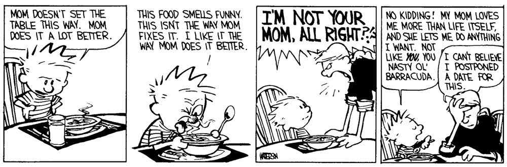 Calvin's parents are so tired of his constant attention-seeking and misbehavior that they use questionable parenting to teach him a lesson or explode in anger when he gets too much on their nerves. They often outright lie to him, to mess with his mind. In one gag, Calvin asks his mother for a baby brother, but only "to have someone smaller to bully". In the next panel Calvin's dad is seen answering a call from his wife to work: "Look honey, could we talk about that operation some other time?", strongly implying that she wants him to have a vasectomy. The only person who actually manages to force the kid into obedience is Rosalyn, his babysitter. But even she has no respect for him. In the end, nobody really likes Calvin, making him a complete outsider. He is so bad at sports that he invents his own game with ever-changing rules: Calvinball. In class, he is unable to focus and doesn't understand much of what is taught to him. It might explain why he actually seeks escapism in his fantasies. Though, on a positive note, he at least has fun, which helps him to carry on. Interestingly enough, Watterson himself also prefers to stay out of the spotlight, rarely making media appearances.