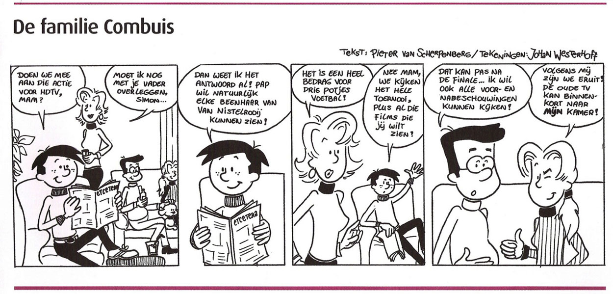 Between 2002 and 2006, Westerhoff illustrated six stand-alone comic stories from three to six pages for the girls' magazine Tina, working from scripts by Frank Jonker or Anne-Rose Hermer. For the local newspaper of Groningen's Korrewegwijk district, he created the monthly comic strip 'Truus en Trea', about two neighbors. His comic 'De Familie Combuis' appeared in the staff magazine of power company Essent.