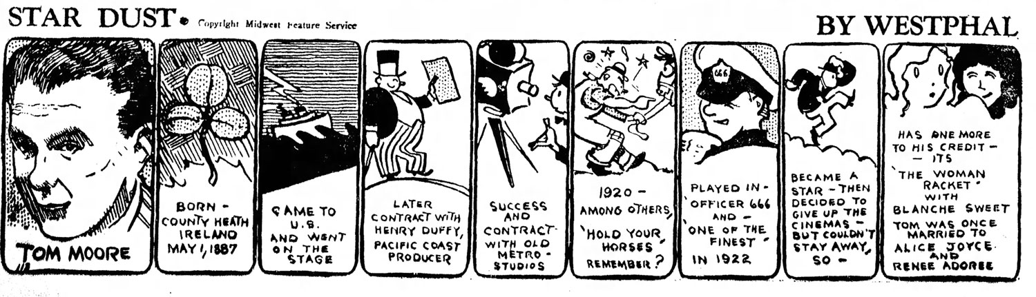 Each episode of 'Star Dust' focused on a particular Hollywood actor or actress and told his or her life story in comic strip form. The first panel was typically a realistically drawn portrait of the Hollywood star with their name underneath it. The other panels told his or her life story in chronological order. Since the comic strip was published at the bottom of each newspaper page the cartoonist had little space for elaborate drawings or narratives. Most of the biographical information is little more than one line per panel. The illustrations are very simple doodles, drawn in a more loose style than the portrait in the first panel. 'Star Dust' debuted in 1929 but it is not clear how long the feature ran. Episodes as late as 1932 have been found. Over 200 strips are known, but none discuss movies newer than 1929. This leads to believe that the syndicate had been selling the feature as a complete set from the start.