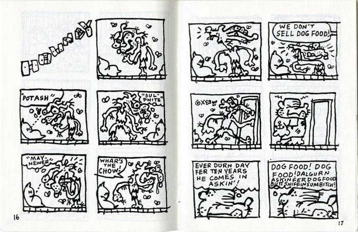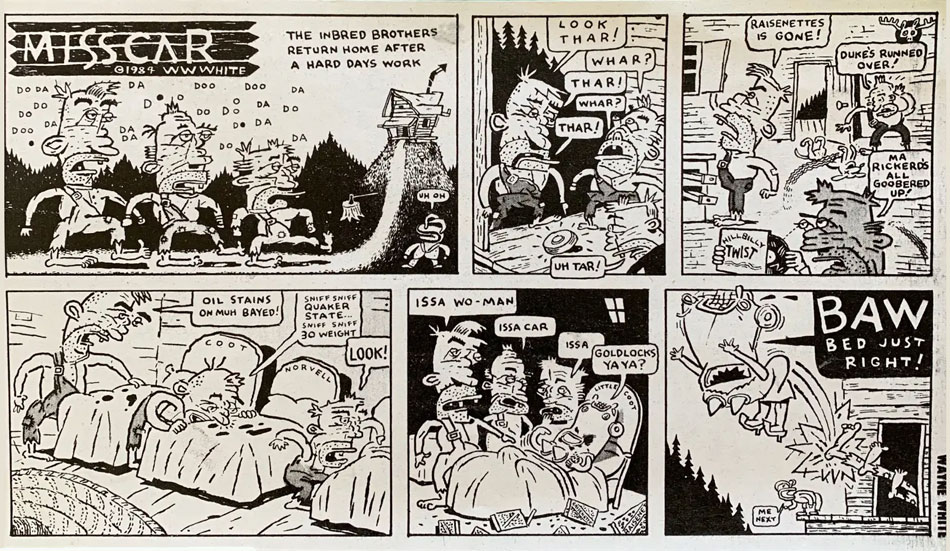 After graduating from Middle Tennessee State University with a BFA in Painting in 1979, Wayne White initially headed for Nashville to pursue his artistic career as an "Abstract Expressionist", but with no luck. After discovering Art Spiegelman's RAW magazine, White decided to move to New York City and try cartooning instead. There, he found work as an illustrator and cartoonist, starting in 1982 at the cultural magazine East Village Eye and then also contributing to papers and magazines like the New York Times, Raw magazine, Bad News, High Times and the Village Voice. One of his regular features was the absurd and abstract 'Miss Car' strip, which first appeared in the East Village Eye and then also High Times magazine. In the meantime, he released his own xerox-printed mini-comics with minimalistic art, such as 'Geedar' (five issues, 1989) and 'Vaga'. In 1990, he contributed the five-page story 'Ronster the Monster' to the Fantagraphics one-shot comic book 'Kaktus Valley'.