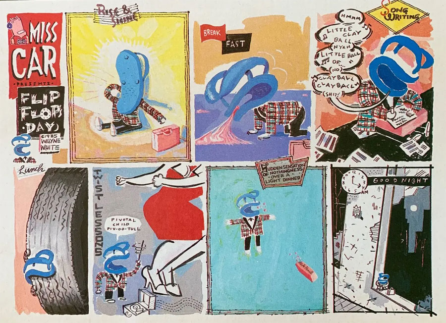 Wayne White is an American multi-disciplinary artist, working as a painter, sculptor, illustrator, animator, set designer and comic artist. As a cartoonist, he worked for several magazines in the 1980s, with 'Miss Car' (1984-1985) being his regular feature in the East Village Eye and High Times magazine. He is possibly best-known as a set and puppet designer for the 1986-1990 TV show 'Pee-Wee's Playhouse'.