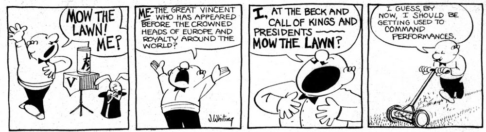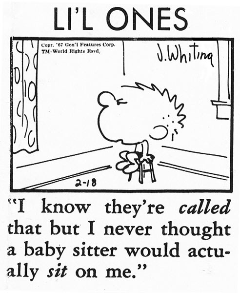 Jim Whiting is an American cartoonist and illustrator. He has published his cartoons in publications like The Saturday Evening Post, Collier's, LOOK magazine, and over 75 other magazines. He has worked for an advertising agency in New York City, and has created countless illustrations for books, magazines and presentations. Through General Features, Whiting has produced the cartoon feature 'Ad Libs' with Len Bruh (1957-1972), and he succeeded Mell Lazarus on 'Li'l Ones' (1966-74) and 'Wee Women (1964-74). Another creation by Jim Whiting is 'Vincent the Magician', that ran in the publication of The International Brotherhood of Magicians. Whiting also made illustrations for manuals, corporate newsletters and trade publications.