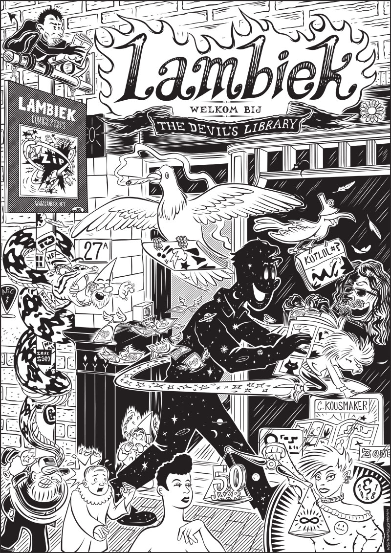 Drawing by Eryc Why for the 50th anniversary of Amsterdam comics shop Lambiek. It appeared in the anniversary book '50 jaar Lambiek' (Les Éditions Lambiek, 2018) and on the cover of the 8 November 2018 issue of the weekly PS magazine supplement of newspaper Het Parool, which featured an article about the celebrated store.