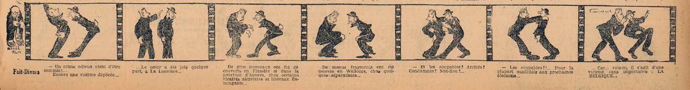 'Le Dernier Film' episodes from Le Soir of 7 November 1921 and 12 July 1923. In the first comic, two men discuss a "horrible" crime where various body parts were scattered in several different provinces. When the other asks who the culprit was, he is told that they'll be candidates for the next elections, because the victim wasn't important: "His name was 'Belgium'." The second comic, in which a father in stereotypical Soviet/Russian costume teaches his infant son on how to be dishonest, features examples of speech balloons.