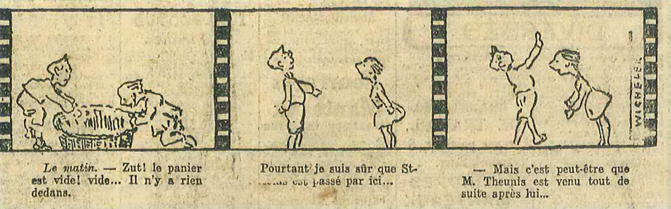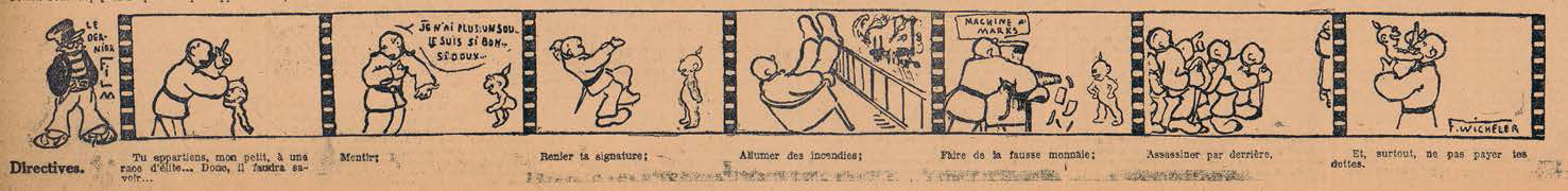 At age 47, Wicheler created the comic strip 'Le Dernier Film' ("The Latest Film"), serialized in the newspaper Le Soir between 18 July 1921 and 1 May 1926. The comic is presented in the style of a film reel, with the panels resembling vignettes with double perforated strips in black with little white dots. To keep in line with this format, Wicheler deliberately kept his artwork minimalistic, with characters usually talking against a white void. Rather than a standard three-to-four panel format nowadays associated with gag strips, 'Le Dernier Film' used seven panels per episode.