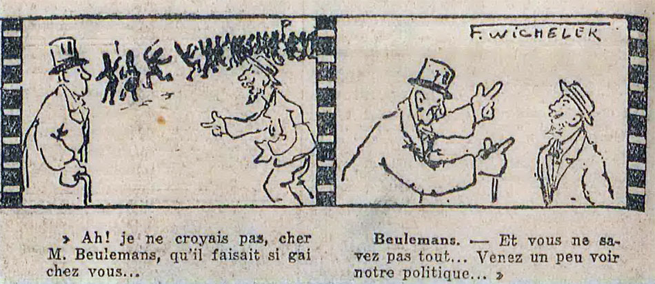 Wicheler's 'Le Dernier Film' is historically significant as the earliest known originally Belgian newspaper comic. Previous Belgian comic pioneers, such as Richard de Querelles, Émile Berchmans, Félicien Rops, Georges Ista, Victor T'Sas (Vias), Auguste Donnay, Henri Cassiers and Willem Seghers, also created comic-like picture stories, but these appeared in weekly magazines instead of newspapers. Even so, 'Le Dernier Film' was published on a weekly basis. Also, Le Soir had no permanent day on which new episodes appeared, making it complicated to track down all the episodes. While 'Le Dernier Film' was serialized on a regular basis, the feature had no real story or recurring characters, except for Mr. Beulemans from Wicheler's play, who sometimes had a guest role. Each episode is self-contained, with characters commenting on whatever was in the news that day. Certain jokes poke fun at Flemish nationalists, Belgian politicians, Communists, suffragettes and Germans. Specific celebrities with cameo appearances are Belgian Prime Minister George Theunis, Nobel Peace Prize laureate Henri La Fontaine, Flemish activist (and future Prime Minister) Camille Huysmans and the head of the Belgian Communist Party Joseph Jacquemotte. This satirical gimmick of including current affairs in a comic was preceded by other Belgian comic pioneers, namely in Richard de Querelles' 'Déluge à Bruxelles' (1843) and Félicien Rops' 'M. Coremans Au Tir National' (1861).