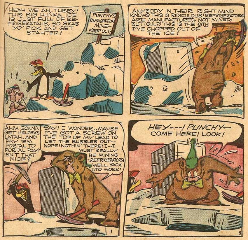 From the mid-1940s until the mid-1950s, Wickersham additionally drew for comic books, sometimes under the pen name Bob Wick. He mainly worked for the American Comics Group (ACG), drawing characters like 'Daniel Spaniel', 'Cindy', 'Natch', 'Spencer Spook', 'Wacky Wolf' and 'Who-Dun-It' for titles like Cookie (1947-1949), Funny Films (1949-1954), Giggle Comics (1946-1953) and Ha Ha Comics (1945-1952). He also drew for several issues of ACG's family comic 'The Kilroys' (1953), and the comic book about the little Indian boy 'Teepee Tim' (1955). The former animator also drew 'The Kellys' (1950) for Timely Comics, and 'Flippity and Flop' and 'Fox and the Crow' for comic books like Real Screen Comics by National Periodicals/DC Comics (1947-1949). He additionally drew funny animal features like 'Colonel Punchy Penguin' and 'Whitey' for the comic books published by Ned Pines (Happy Comics, Coo Coo Comics, 1946-1949).