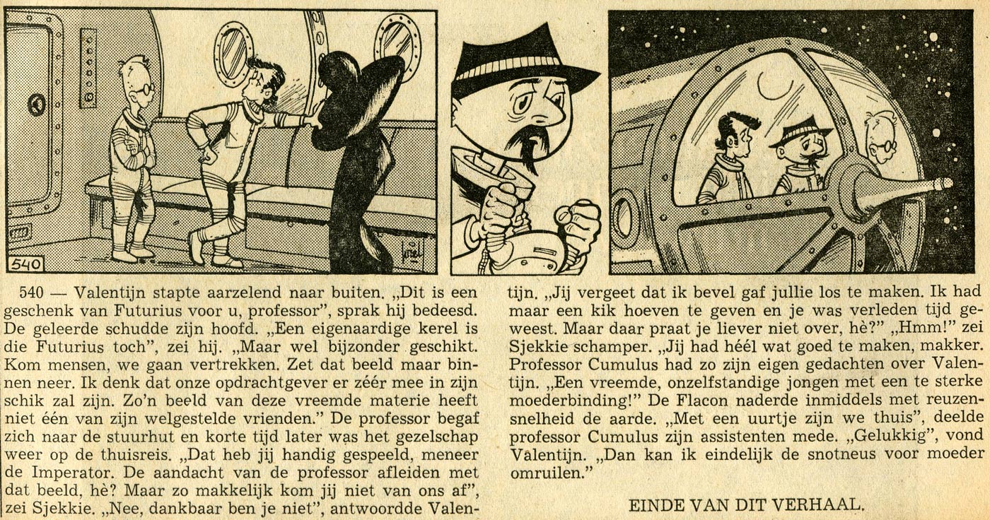 Wiegel's earlier creation for Kris Kras, 'Professor Vliegop', evolved into his best-known comic strip, 'Professor Cumulus', whose adventures appeared between February 1967 and June 1970 in newspaper De Volkskrant. Cumulus is a mad scientist who enjoys all kinds of space travel adventures to faraway planets. A total of 17 stories were serialized, all in the text comic format, with text captions underneath the images. The character should not be confused with Professor Kumulus, the absent-minded professor in the Belgian comic series 'Piet Pienter en Bert Bibber' by Pom. Since 2004, a street named after Professor Cumulus is a part of the "Comic Heroes" district in the city of Almere.