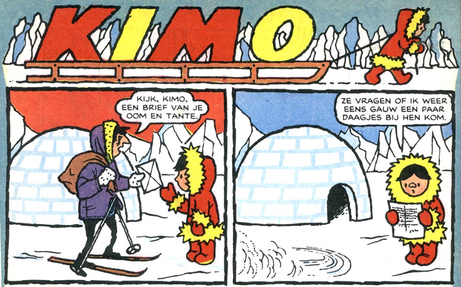 In the 1960s, Wiegel's work also made its appearance in children's magazines. He made illustrations, cartoons and comic strips like 'Tiep' (1960-1965) and 'Professor Vliegop' (1962-1965) in the literary and artistic children's magazine Kris Kras. For the Malmberg school magazine Okki, he developed the little Inuit boy 'Kimo', whose adventures first appeared in 1965. Kimo later received a girlfriend, Kaja, which in 1970 led to a title change to 'Kimo en Kaja'. The series continued until 1975. For the weekly family magazine, Weigel created the comic 'Tiener' (1965).