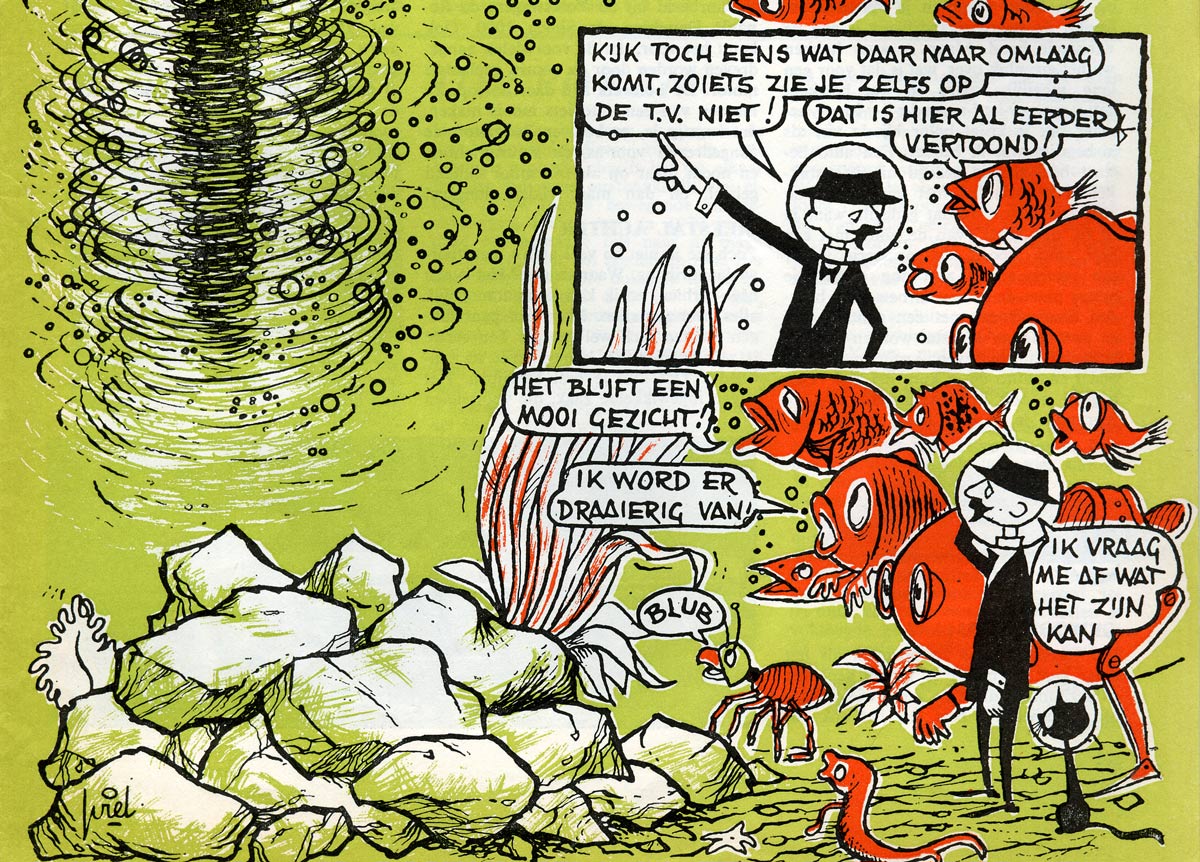 In 1951, Wiegel gave up his day job to become a cartoonist. He offered his services to German magazines, because they offered a better fee, and saw his work published in the Neue Illustrierte and Frankfurter Illustrierte. In The Netherlands, he began his cartooning career in several specialized magazines and newspapers. He had a monthly strip called 'Conny' (1958-1965) in Co-op Nieuws, the in-house magazine of Co-op supermarkets. Also for Co-op, Wiegel made cartoons and illustrations for information booklets about cooking ('Even Iets Lekkers Maken', 1966) and domestic chores ('Eigenhandigheidjes', 1968), both written by Hans van Holten. In Disco Discussies, a magazine for gramophone enthusiasts, he drew 'Hoezepoes' (1958-1960).