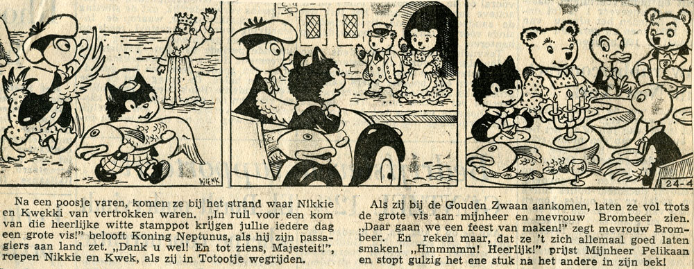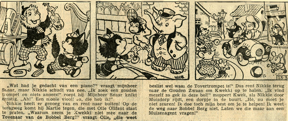 After Beek's death in 1953, Wienk continued to draw 'Noddy' for the next 17 years. By now operating through his own Studio Wienk, he additionally made features and illustrations, appearing in Dutch, English and German newspapers. These included a series about the wonders of nature, and a text comic about a cat called 'Nikkie', of which 11 stories appeared during the 1950s.