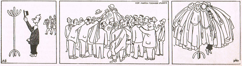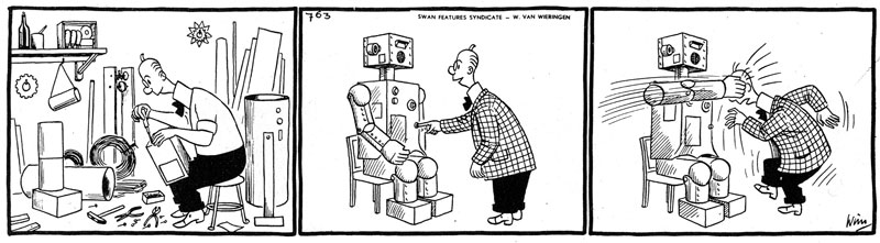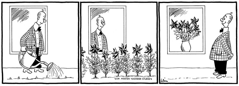 Van Wieringen's best known creation, however, was 'Simpelman', who first appeared in Tom Poes Weekblad in 1947. The absurd daily adventures of 'Simpelman' then appeared in newspapers in Copenhagen (Dagens Nyheter) and Paris (France Soir). During the 1960s the comic strip was a permanent guest in regional papers like Het Parool (1963-1968) and Limburgsch Dagblad. Van Wieringen had already left the Toonder Studios by then. He married Margje Herblot, Jan Gerhard Toonder's former wife. 'Simpelman' was from then on distributed to newspapers by Ton de Zwaan's Swan Features Syndicate. All in all more than 3.000 comics of 'Simpelman' were made.