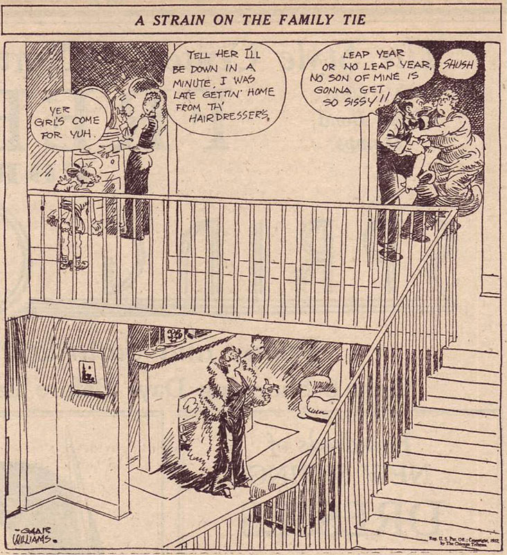 A Sunday piece for 'A Strain on the Family Tie' called 'Mort Green and Wife' started with a topper called 'Zipper' appeared between 1931 and 1933, and from then on under the title of the daily panel. The feature was continued by Bob York until 1936 after the death of Williams in 1935. By the time of his death in 1935, his cartoons were being published in 39 newspapers.