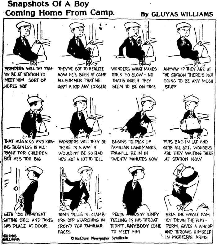 Other observational comedy by Williams was presented in a comic strip format, most prominently in 'Snapshots of…' (published in The Boston Globe from 11 September 1922 on) and, occasionally, 'Suburban Heights' too. In his one-panel cartoons, Williams was often forced to include lengthy summarizations underneath the drawing to describe how the characters found themselves in their particular situation. By using a comic strip style, he could simply visualize the foreplay and aftermath to these situations step by step, panel by panel. He could, for instance, show a man trying to kill time before his train arrives. Or a father trying to read his paper while constantly being interrupted by his curious son. The comic strip format was particularly efficient to poke fun at people stuck in repetitive behavior or needlessly time-wasting endeavors. For instance, a man going through several attempts to stick an already used stamp on a new envelope. Yet even when a character does little more than just go back and forth between the same motions, or simply sit in a chair looking around, Williams kept the artwork interesting. Each pose in each panel was still drawn individually, with small changes.