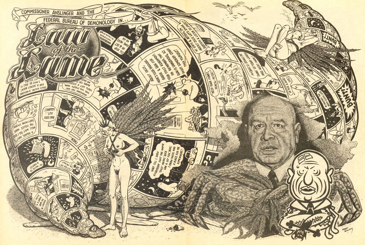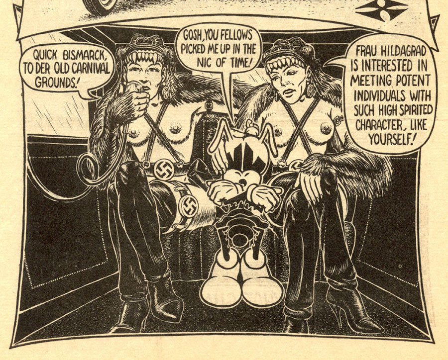 In the second half of the 1960s, Williams' interest was sparked by another attractive subculture: underground comix. Zap Comix by Robert Crumb blew his mind the same way Mad Magazine did. He quickly joined the underground movement and contributed comics to Gothic Blimp Works, Felch Comics, Coochy Cooty Men's Comics, Snatch Comics, Snatch Cumics, Tales from the Tube and naturally Zap Comix itself from the late 1960s through the 1970s and 1980s. His signature series was 'Coochy Cooty' (1969), which featured an insect-like creature drawn in the style of a 1930s cartoon character by Walt Disney or Max and Dave Fleischer. In Williams' comics, though, all innocence is gone. Coochy Cooty is an anti-hero who lives in a depraved world full of sex and drugs. The character appeared in various underground titles, but also featured in one stand-alone comic book: 'Coochy Cooty Men's Comics' (1970), published by The Print Mint Inc. The adventure has Coochy fighting against a bunch of women who are half gorilla, half Nazi.