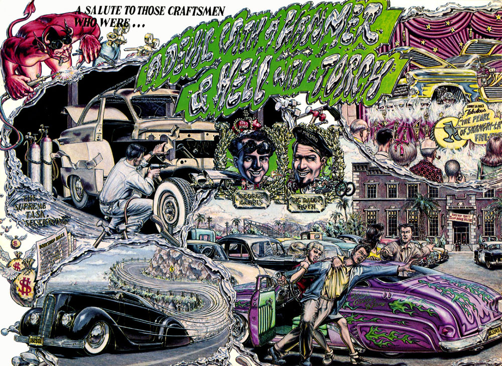 When Williams applied for a job at Ed "Big Daddy" Roth's studio, Roth at first didn't think much of his young candidate. To test him, he gave him a seemingly impossible task: draw and paint a '54 Plymouth car with Roth's signature character the Rat Fink behind the wheel. To Roth's astonishment Williams was back the next day and handed in a perfect rendition. He was instantly hired and replaced Roth's previous art director, Ed Newton. Williams had to draw "hot rod" imagery suitable for vehicles and T-shirts and advertisements for the company. He excelled in depicting spectacular reflection on the chrome hoods of cars and his artwork always looked gorgeous and eye-catching. Williams also produced four issues of Roth's magazine and built cars and motorcycles, such as "Captain Pepi's Motorcycle & Zeppelin Repair" (later renamed "Mega Cycle"). Unfortunately, Williams' imagination was too wild, even for the "hot rod" fans. Roth gave him a long list of taboos he wasn't allowed to depict. It didn't help much, because after a while advertisers didn't even want to publish his artwork anymore. Nevertheless, Roth remained employed with the studio until it closed down in 1970.