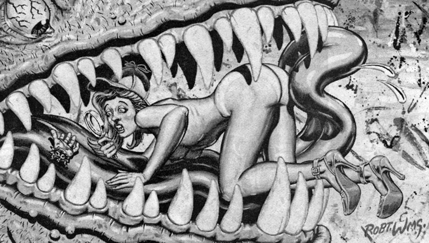 In 1979, Williams published his first book, 'The Lowbrow Art of Robert Williams' (1979), which went through numerous reprints and updates over the decades. The most recent reprint happened in 2022, by Last Gasp. In 1990, his art was collected in the book 'Zombie Mystery Paintings' (Last Gasp, 1990), which features a foreword by Robert Crumb. All books are highly recommended, much as Mary C. Reese and Doug Blake's documentary 'Robert Williams, Mr. Bitchin' (2010). Fantagraphics also published a volume with Williams' surrealistic art named 'Malicious Resplendence' (1999).