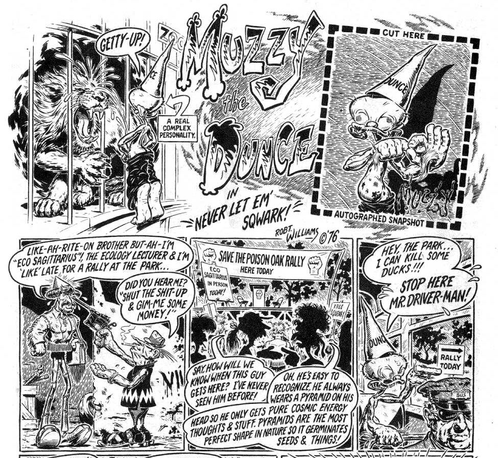 Between 1969 and 1974, Williams was one of many artists to appear in the fanzine Promethean Enterprises, where Al Davoren, Rick Griffin, Robert Crumb and Bob Zoell also published. In August 1975, he illustrated the cover of the one-shot comic book Felch Cumics. The title was thought up by Williams, who once heard that rock singer Ed Sanders of the rock band The Fugs used the word "felch" to describe someone licking sperm from a person's asshole after anal sex. The book featured graphic contributions by Evert Geradts, S. Clay Wilson, Robert Crumb, Jim Osborne, Joe Schenkman, Jay Lynch, William G. Stout, Michael McMillan and Spain Rodriguez. Felch Cumics was so depraved that police officers took it along with them during a raid in a comics store in Long Beach. They were convinced that it could help them push through a ban against lewd comics. According to underground cartoonist George DiCaprio, during the trial the policemen couldn't find their copy anymore, thus eliminating the case there and then.
