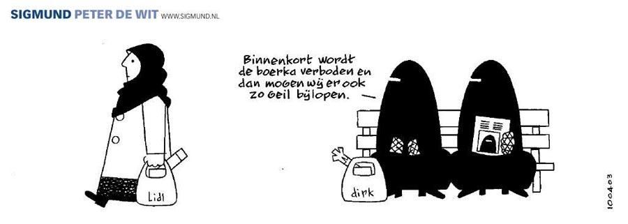 De Wit once spotted a pair of women dressed in burkas in a local supermarket. The strange image intrigued him. He used the round, black tampon-like shapes, reminiscent of Dick Bruna's children's books, to portray a group of Muslim women dressed in burkas who always carry grocery bags. The characters debuted in 'Sigmund' around 2005. Much of the comedy is derived from the fact that they all look identical, while readers never know what they look like underneath their pitch black dresses. Right from the start, 'Burka Babes' met with controversy, because some felt it ridiculed islam, Arab culture and/or women. However the strips are never stigmatic or vicious. At the same time the characters were very popular with readers too. So much in fact that it became a spin-off, which even eclipsed 'Sigmund' in foreign popularity, finding an international audience among English, French, Spanish, Italian and Czech readers. Nevertheless, De Wit discontinued the series after a few years because he grew tired of it.
