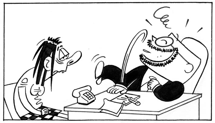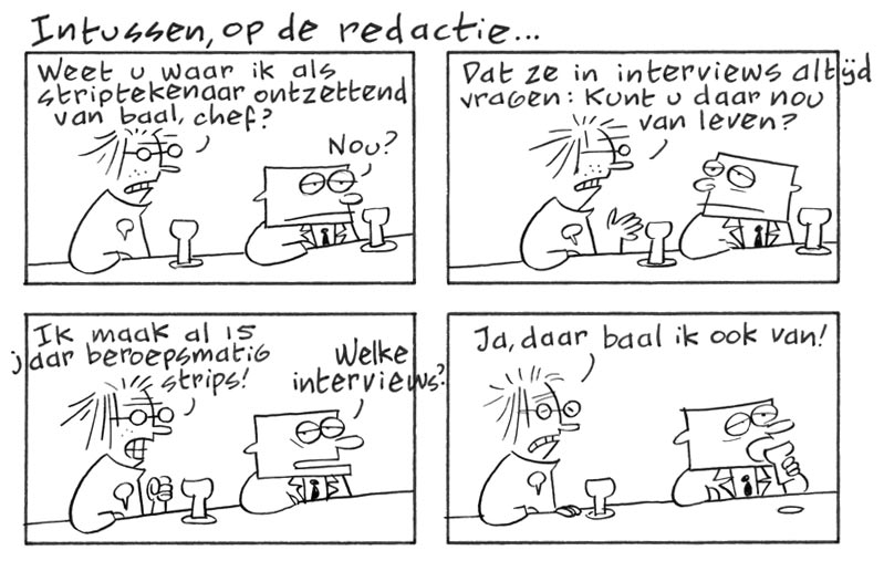 'Intussen Op De Redactie...' ('De Chef'/'Redactiestripje'). Translation: "You know what irritates me as a comic artist, chef?" - "Well?" - "That people in interviews always ask me: can you earn a living with that? I make professional comics for over 15 years now!" - "What interviews?" - "Yes, that irritates me too."