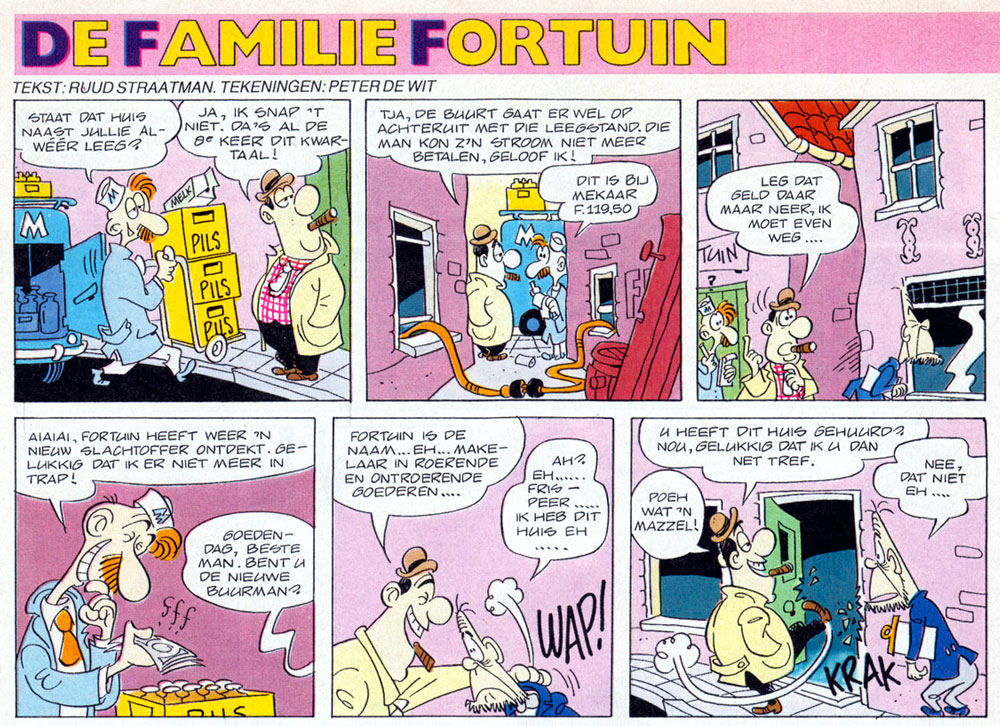 In 1985, Eppo changed its name and became a vehicle to promote the Dutch comics information TV show 'Wordt Vervolgd' for three years, under the title Eppo/Wordt Vervolgd. In the very first issue, from 23 August 1985, scriptwriter Ruud Straatman and artist Peter de Wit launched a long-running comic series which would become De Wit's breakthrough: 'De Familie Fortuin' (1985-1998). The Fortuin family are a bunch of marginals whose dubious activities irritate and/or terrorize their neighborhood. The initial idea came from scriptwriter Jan van Die, who knew a certain family in Amsterdam, the Cohens, who had 12 children and whose father was such an efficient salesman "that he was able to sell the very TV set we were watching." Yet Van Die insisted that the Cohens were actually very nice people compared with the comic characters.