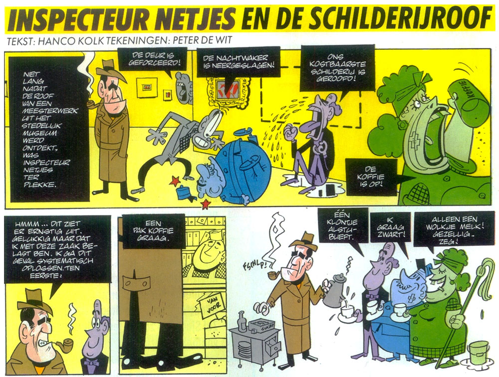 De Wit also worked with Hanco Kolk on the riddle comic 'Inspecteur Netjes', which debuted in Sjors en Sjimmie Stripblad on 1 April 1989. The inspector, modeled after Humphrey Bogart, introduced a mystery presented on one full page. Readers could find out the solution by leafing further through the magazine to a follow-up page, where Netjes explained everything. The first three episodes were drawn by De Wit, but after that Kolk took over, using his more linear drawing style. In 1992, De Wit left the series altogether, but Kolk continued it on his own until the final issue of the magazine in April 1999, by now a monthly titled Striparazzi. 'Inspecteur Netjes' was reprised by Kolk in Veronica Magazine between 2002 and 2004.