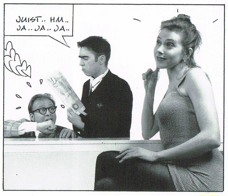 Thanks to their appearances in the photo comic 'Mannetje & Mannetje' and its animated TV adaptation, Kolk and De Wit became very recognizable to mainstream audiences. Their notability increased when they hosted a docu TV series on Teleac, which specializes in educational programming for adults. Their series, 'Strip & Cartoon Tekenen', was broadcast in eight episodes between 24 January and 18 March 1993. Kolk and De Wit explained how to draw characters, motions, backgrounds, compositions and how to write stories. In between they played comedic skits in the studio, intercut with footage where Monique Hagen interviewed famous cartoonists about their profession. Among the legends brought in front of the camera were Gerrit de Jager, Albert Uderzo, Ed van Schuijlenburg, François Walthéry, Henk Kuijpers, Theo van den Boogaard, Wilbert Plijnaar, colorist Wilma Leenders and Martin Lodewijk. Teleac also made 'Strip & Cartoon Tekenen' available on video and as a guidebook, authored by Frans Le Roux and Jesse van Muylwijck. The series drew high ratings and has frequently been repeated on Dutch television in later years.