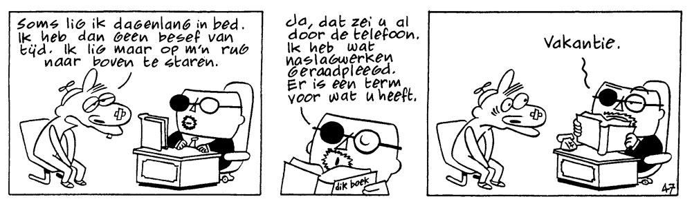 Early 'Sigmund' strip, which was actually featured in one of the Teleac episodes. Translation: "Sometimes I lie in bed for days. I don't notice time passing by. All I do is lie on my back, staring at the ceiling." Answer: "Yes, that's what you told me by phone. I consulted a few reference books. There's a name for what you have: vacation."