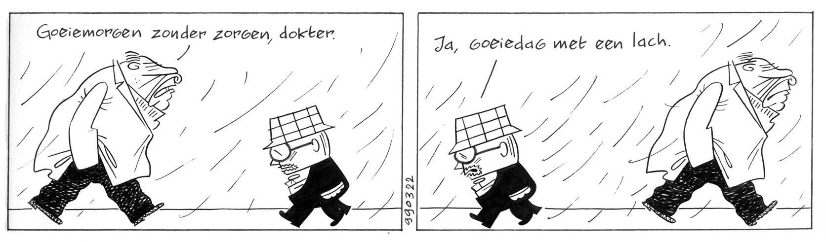 Kolk and De Wit continued their comics collaborations in Eppo (and its retitled incarnations Eppo/Wordt Vervolgd, Sjors en Sjimmie Stripblad, SjoSji) throughout the late 1980s and the 1990s. They sometimes performed in theater shows, where the duo played David Livingstone and Henry Morton Stanley, although most of their sketches were set in restaurants or at the doctor's place. Kolk and De Wit reused these characters but under the more vague descriptions "Mannetje en Mannetje" ("Little Man and Little Man") and introduced them to readers in the first issue of Sjors & Sjimmie Stripblad on 19 February 1988. The two sympathetic but somewhat clumsy chaps live out awkward situations in a series of sequential photos where the backgrounds are typically drawn around them, as are the onomatopoeia and movement lines. Most episodes were black-and-white photographs, made in the studio of Nick van Ormondt, but in the final episodes color was used. 'Mannetje & Mannetje' survived Sjors en Sjimmie Stripblad's name change in 1994 as Sjosji and new episodes ran until the penultimate issue of 1995, on 15 December. 'Mannetje en Mannetje' also ran in English translation in the comedy magazine The Truth as 'Jones and Jones'. Colleagues Aloys Oosterwijk, Kees de Boer, Wilbert Plijnaar and Eric Heuvel made guest appearances in the episodes.