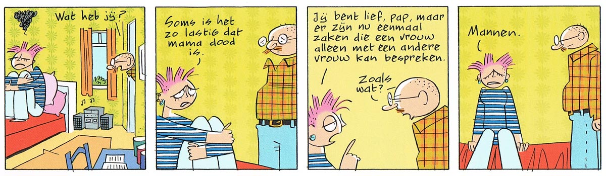 'Vader & Dochter'. Translation: "What's your problem?" - "Sometimes it's so difficult that mum has died. You're sweet, dad, but there are things a woman can only discuss with another woman." - "Like what?" - "Men."