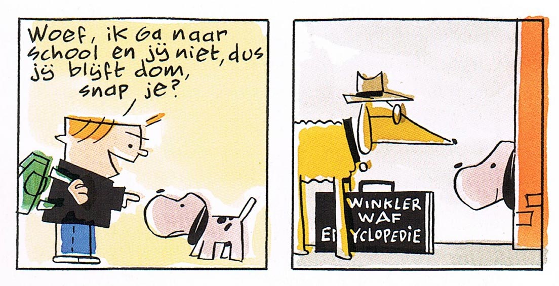'Woef en Wimpie'. Translation: "Woef, I'm going to school and you're not, so you'll stay stupid, understand?"  A dog then brings Woef a copy of the Encyclopaedia Barkannica.