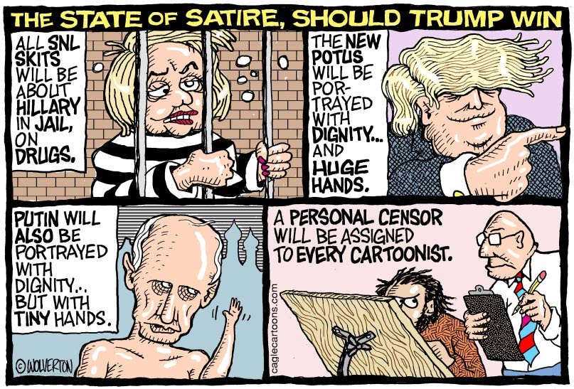 Cartoon by Monte Wolverton, 2016, caricaturing Hillary Clinton, Donald Trump and Vladimir Putin.