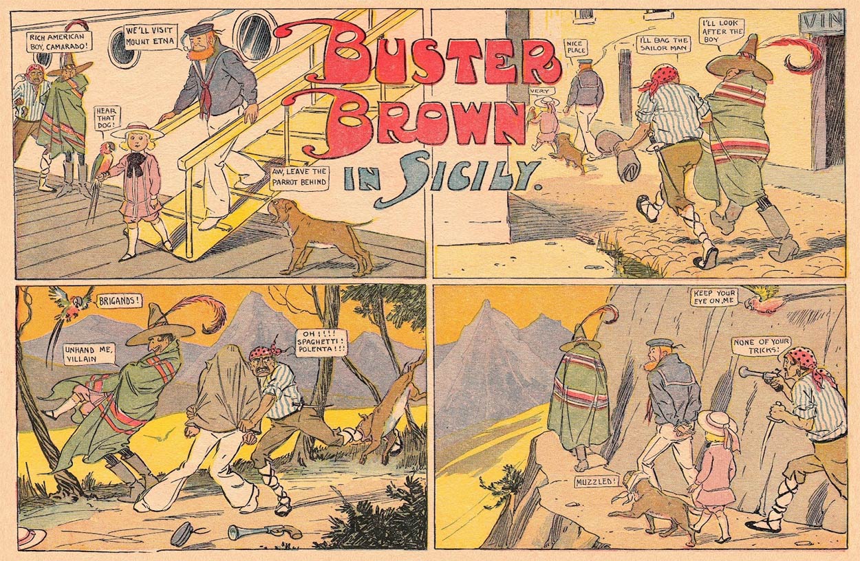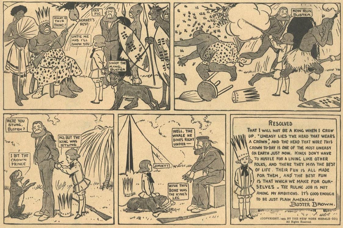 Within the realm of comics, Wood is an interesting footnote in the history of 'Buster Brown'. The strip was created by comic pioneer Richard F. Outcault for the New York Herald in 1902. By 1905, Outcault got a more lucrative deal from William Randolph Hearst's The New York American. He took his well-known characters Buster Brown, Mary Jane and the dog Tige with him, but wasn't allowed further use of the title 'Buster Brown'. Therefore, titles like 'Buster and Tige' and 'Buster and His Friends' were used alternately in The American from 14 January 1906 onwards, while the Herald continued to print 'Buster Brown'. Herald editor Reick hired a host of anonymous artists and writers to continue the strip about the mischievous little boy, although with slightly redesigned characters. William Lawler was the main artist of the Herald's imitation, which ran from January 1906 until 1914. Other involved artists were Wallace Morgan, Norman Jennett and Winsor McCay. Worden Wood was responsible for a noteworthy series of episodes from 1909, in which the mischievous boy travels to Africa and Europe by boat. Despite the more adventurous setting, Buster continued to prank, and each episode ended with a typical moral lesson. The story was collected in the booklet 'Buster Brown on His Travels' by Cupples & Leon in 1910.