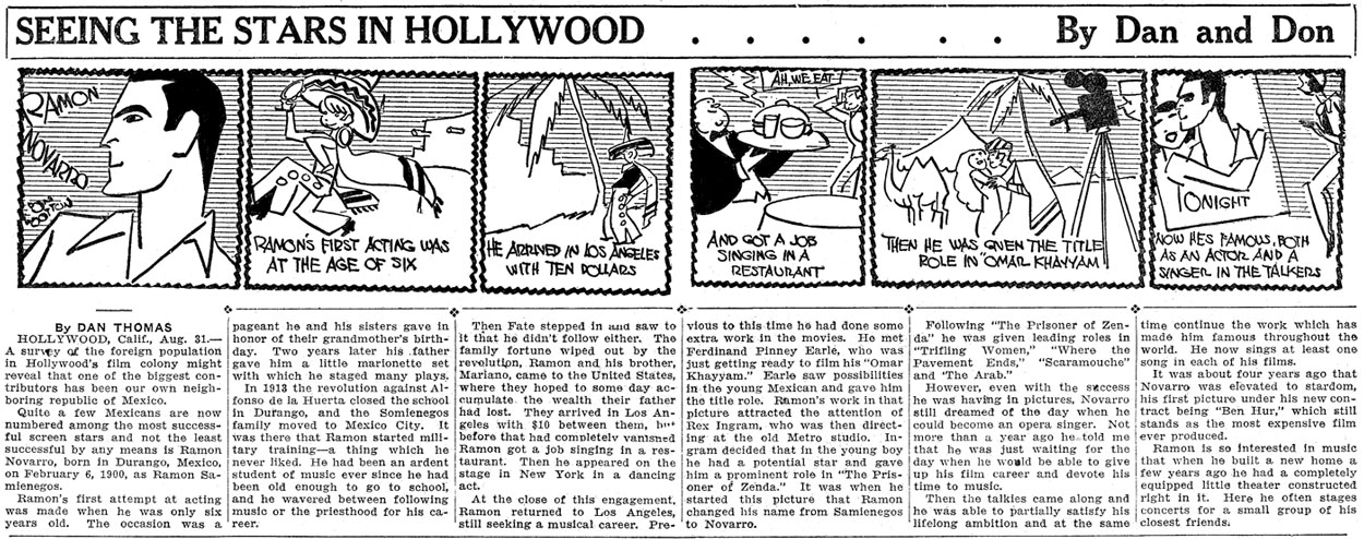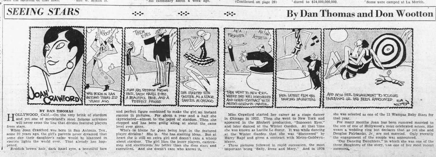 Another feature drawn by Wootton for the NEA was 'Seeing Stars' (April 1929-1930), which also appeared under the title 'Seeing the Stars in Hollywood'. Each installment offered a short biographical introduction to a popular Hollywood star, drawn by Wootton in six panels with text captions. Underneath the strip more detailed information was provided in a lengthy typeset text by Hollywood columnist Dan Thomas. The strip, credited to "Don and Dan", therefore had a similar approach as Westphal's 'Star Dust' (1929-1931), which ran through Midwest Feature Service in the same period. Subsequent "illustrated trivia" columns about celebrities presented all the information in one big illustrated panel with captions, such as Bud Thompson's 'Screen Oddities' (1931-1943), Wiley Padan's 'It's True' (1933-1947), Feg Murray's 'Seein' Stars' (1933-1951) and George Scarbo's 'Closeup and Comedy' (1934-1939).
