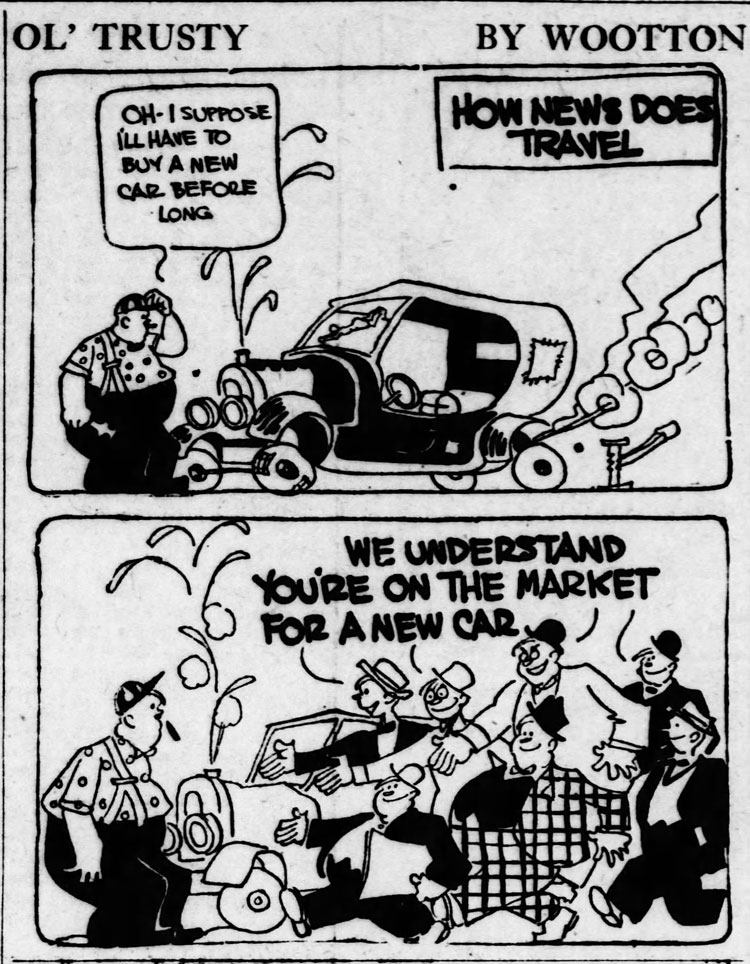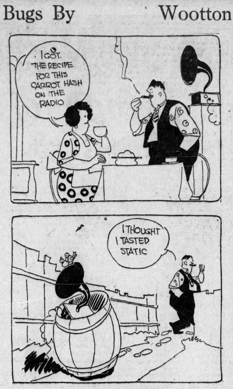 By 1927 Don Wootton had an association with the Newspaper Enterprise Association as both a caricaturist and cartoonist. Among his early tasks for this syndicate was continuing features like 'Bugs' (August-September 1927) and 'Ol' Trusty' (July-November 1927), which appeared in the radio and automobile sections of newspapers, respectively. Both had previously been drawn by other NEA artists like Charles D. Small, George Swanson and a certain Sefcik. Some of the later 'Bugs' strips are credited by Wootton, but signed by Joe King, however.