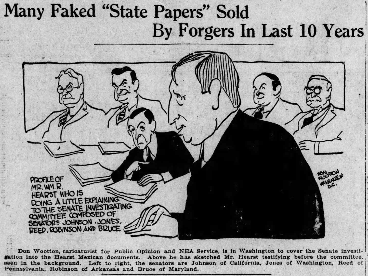 Caricature by Wootton of William Randolph Hearst, during a 1927 Senate investigation for the Public Opinion.