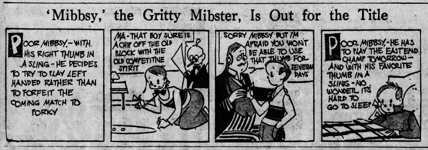 During the 1930s, Wootton worked mostly for commercial journals as a caricaturist and cartoonist. He also returned to the Cleveland Plain Dealer with illustrations for the news-oriented 'The Week On Parade' and its successor 'Personalities on Parade' (29 January 1933 - 8 July 1934). He also had a daily kids' strip called 'Mibbsy, the Gritty Mibster' around 1934, but it is unknown through which syndicate it was distributed. Don Wootton spent most of his later career working for the D'Arcy Advertising Company. He left in 1961 to set up his own shop. The artist however died of a self-inflicted gunshot wound in a park near his home in April 1962. In an obituary published in the Plain Dealer on 20 April 1962, his wife Ruth declared that the sensitive artist had been worried about the success of his own art studio.