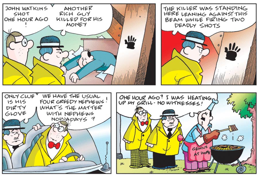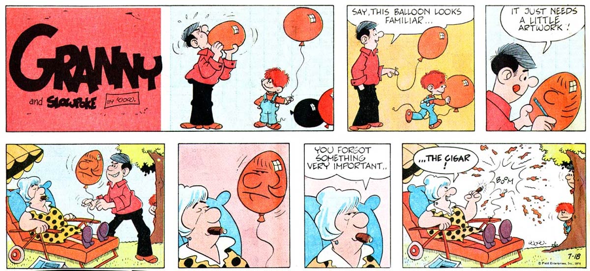 The 'Crime Quiz' was not Wejp-Olsen's first publication in the USA, however. His comic 'Granny and Slowpoke' was distributed to about 40 US newspapers by Field Enterprises from 12 July 1976 until 1977. The main character was a cigar-chomping lady, who lives together with her daughter, grandchildren and dog. The artist deliberately chose a positive approach for this family comic, although the elderly title character was non-conformist and a rebel against authority. The daydreams of the dog Slowpoke provided an extra fantasy element. Despite WOW's obvious influences from US cartoonists like Mort Walker and Dik Browne, it didn't really catch on in the USA. The US strip was canceled after only a year, after which the artist reprised it in Denmark as 'Momsemor' in 1977. It has remained in print in Scandinavia for many years. In Sweden, it for instance ran in Lilla Fridolf, Expressen and Nya Wermlandstidningen, while in Denmark it was published in the weekly Hjemmet magazine.