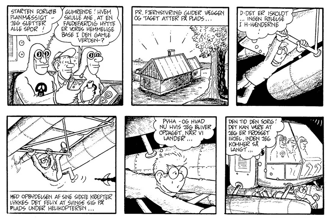Between 1972 and 1977 Wejp-Olsen drew 24 adventures of 'Felix', a character often described as the Scandinavian version of Hergé's 'Tintin'. 'Felix' was written and drawn in a semi-underground style by Jan Lööf from 1967 until 1972. Wejp-Olsen wrote his first stories himself, and then worked in collaboration with Ole Munk Rasmussen between 1976 and 1979. WOW dropped most of Lööf's original political left-wing overtones, and instead focused on major issues like pollution, energy crisis, the third world, new energy sources, and food distribution as the basis for funny, whimsical, and satirical plots. Rasmussen, Jens-Peder Agger, Per Sanderhage, Per Vadmand and Mårdøn Smet worked on new stories until the series came to an end in 1986. 'Felix' was syndicated by the press agency PIB, and appeared in such newspapers as Politiken (Denmark) and Dagens Nyheter (Sweden).