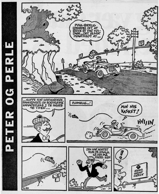 The Danish magazine Jyllands-Posten ran Wejp-Olsen's first strip, the humorous adventure serial 'Peter og Perle' ('Peter and Bonzo') from 1966 until 1979. The comic, starring the boy Peter, his faithful dog Perle and the secret agent Uffe Athoni, also ran in Swedish papers and magazines like Expressen and Serie-Pressen under the title 'Petter och Pärla'. The comic drew inspiration from Hergé's 'Tintin' and the popular 1960s 'James Bond' movies.
