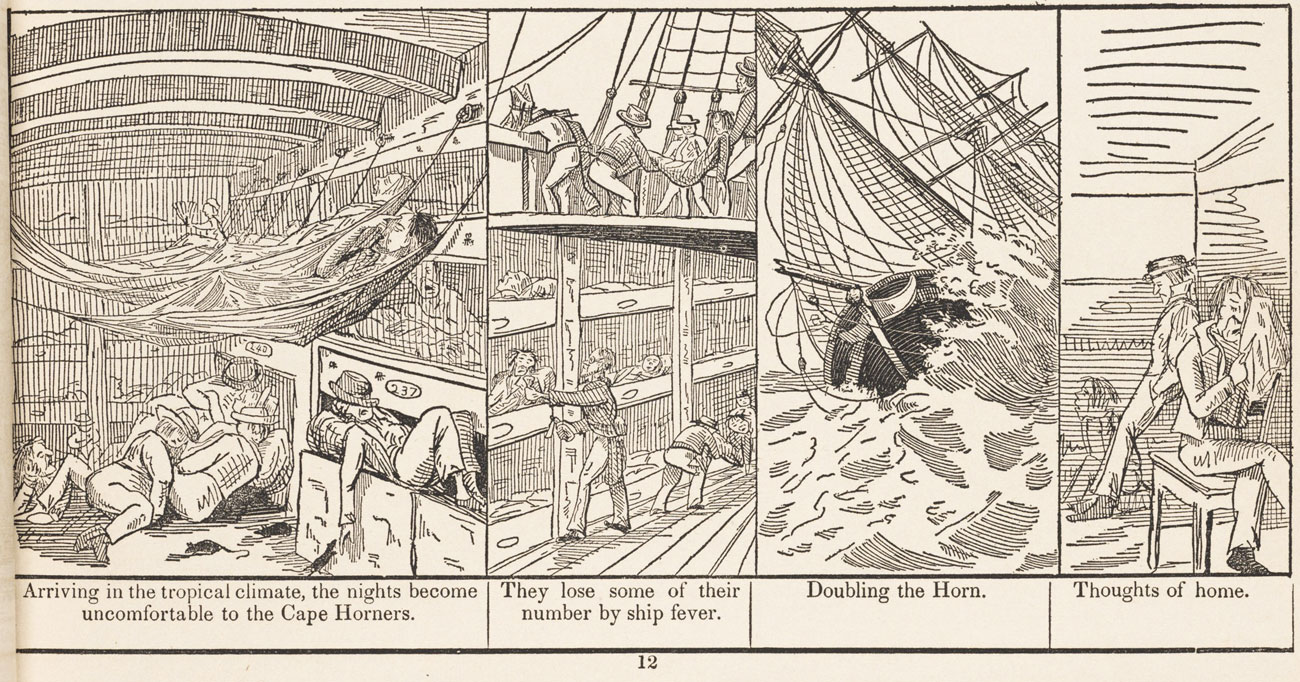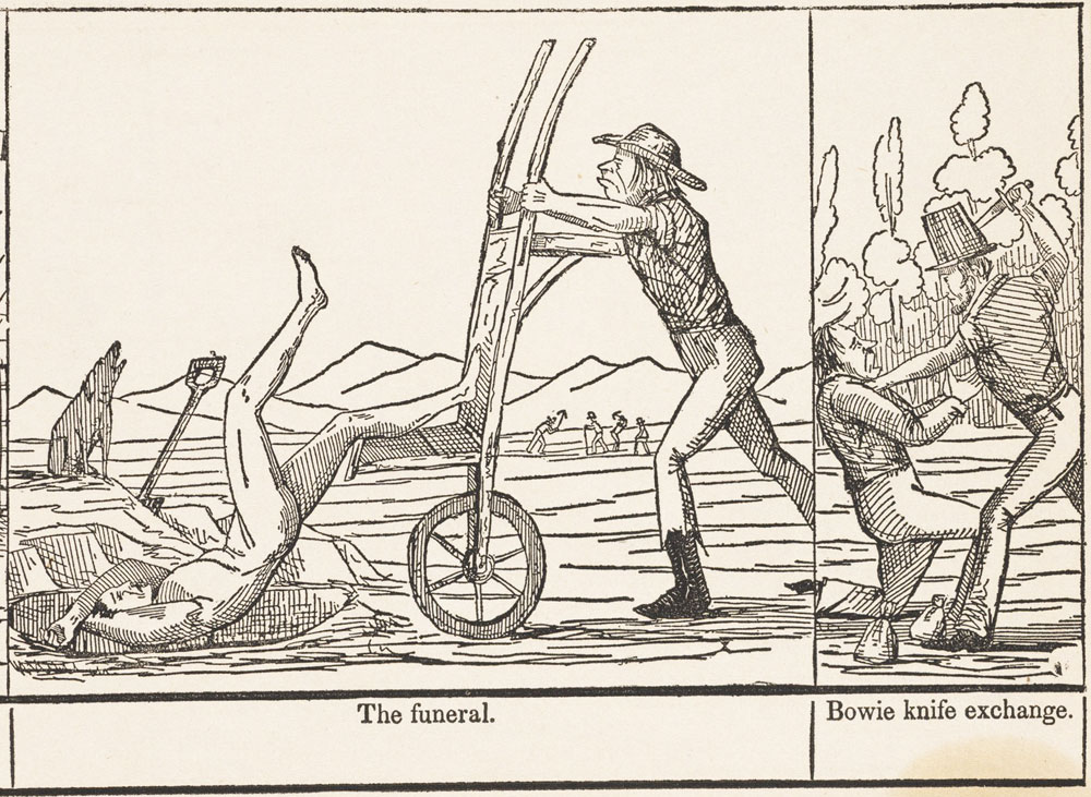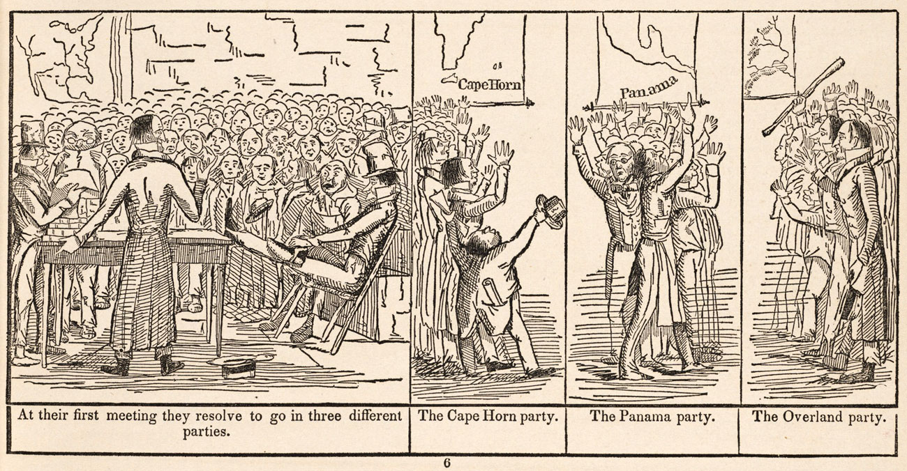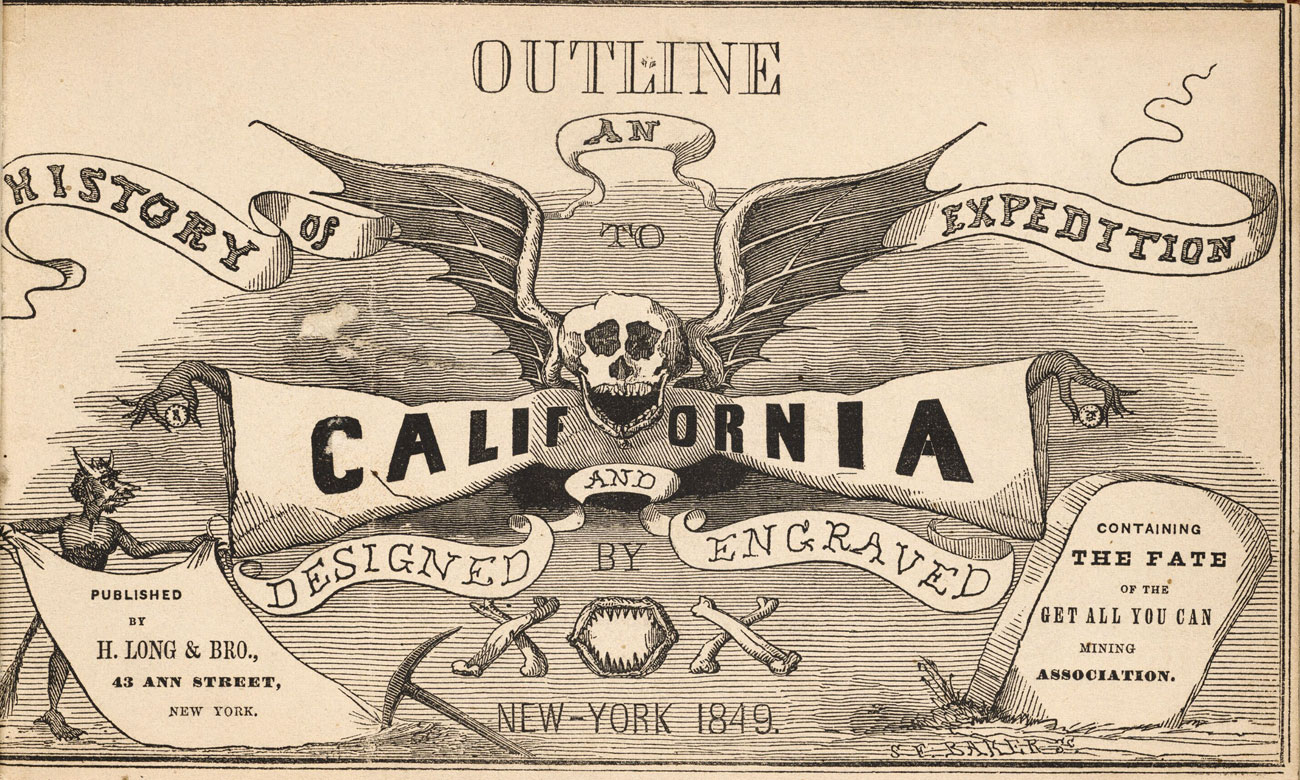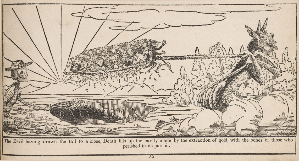 In 1849 an anonymous artist credited as "XOX" drew 'Outline History of an Expedition to California', a landscape format book published by H. Long & Bro. in New York. The story follows three groups of people on three different traveling routes. One travels across the Great Plains, the other past Cape Horn and still others through Panama. During the voyages, the characters endure severe hardships, including encounters with pirates and Native Americans. Even those who make it to San Francisco fall victim to robbers and other agony. Readers may have seen it coming, because at the start of the story, the Devil and the Grim Reaper hide gold in California as "bait" to attract greedy people. In the final panel, the duo carries off thousands of fortune seekers to Hell. The final line is chilling: "The gold was made with the bones of those who perished in its pursuit." The only character to enjoy a happy ending is one Jonathan Swapwell. He travels safely, finds gold and returns home to marry his sweetheart.