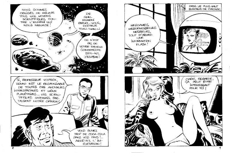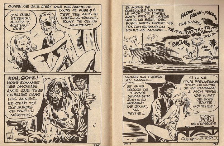 Besides 'Kébir', Suat Yalaz also worked on other productions for SFPI. He, for instance, created the new "spaghetti western" heroes 'Ringo' (1971-1972, known in Turkey as 'Soni Ringo') and 'Sony' (1972-1974) for their pocket book line in a style inspired by Jean Giraud, and filled in for Jean-Marie Nadaud as scriptwriter for the 'Zorro' comic book (1971), drawn by Jean Pape. His feature 'Kaana l'Enfant Terrible du Jungle' was a comical 'Tarzan' parody, but it is unknown where or if it was ever published. Under the pen names Gi-Toro, Jimmy Toro or Walter Kimm he worked on many pornographic comic books for publishers like Elvifrance, Cottreau, Edilau, S.P.S., such as 'African Love' (1986), 'Anna' (1980-1982), 'Emma' (1979), 'Eros BD' (1982-1986), 'Futurella' (1984-1985), 'Kora', 'Lady Sex' (1981-1984), 'Lovisex' (1982), 'Privé (Détective strictement privé)' (1979), 'Sadissimo' (1984-1986), 'Satanika', 'Satarella' (1982-1986), 'Sex Negros' (1986-1987), 'Super Flic' (1979-1980) and 'Sylvia' (1981). 'Futurella' and 'Satarella' were obviously inspired by Jean-Claude Forest's 'Barbarella'. 'Privé (Détective strictement privé)' and 'Super Flic' both had the private investigator Pat Magnum as main hero. Yalaz was eventually succeeded on the comic book by the artist Vince Vita (A.K.A.. Enolativ Motticella).