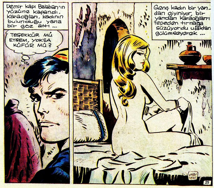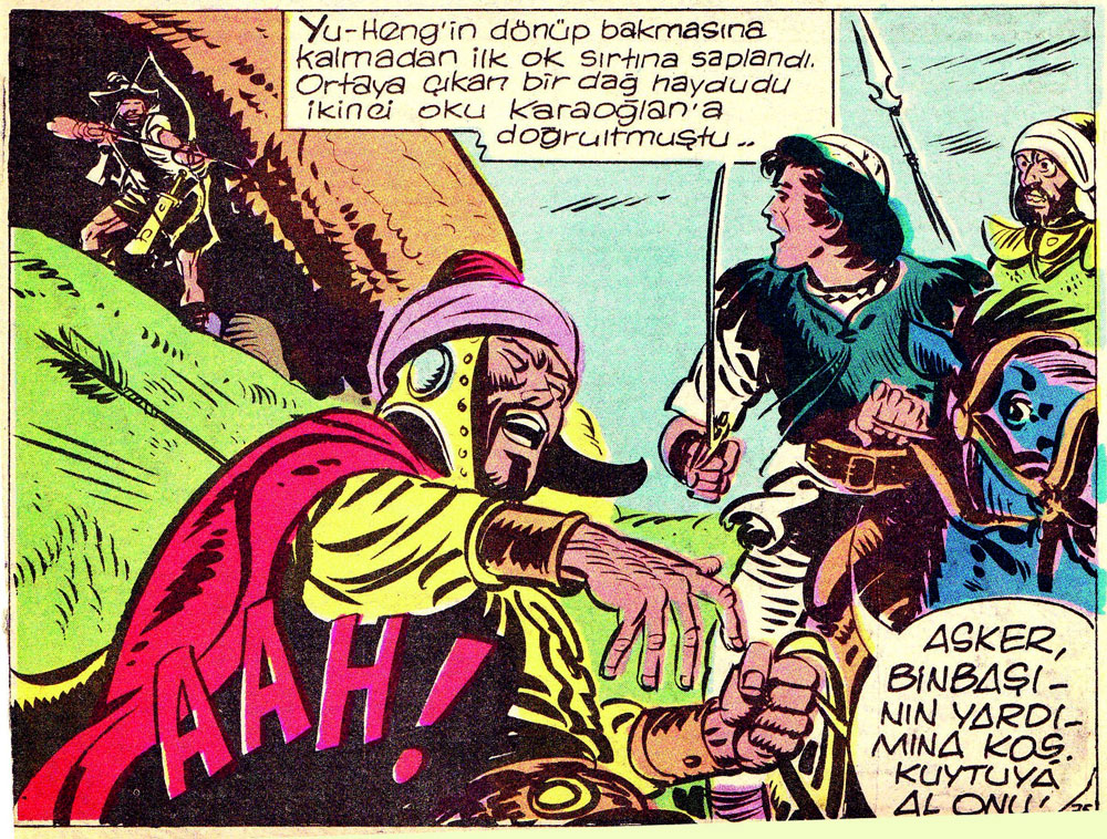 Yalaz, in the meantime, had restarted 'Karaoglan' as a series of weekly comic books, of which the first issue was released on 1 April 1963. The series was continued by a variety of publishers until 2002, detailing the nomadic travels of the 23-year old Uyghur hero through China, India, Constantinople and Siberia. Hal Foster's 'Prince Valiant' was an obvious inspiration, while Turkish history and folklore were the series' other ingredients. The author tried to remain faithful to the language and daily life of the 12th and 13th century. Aimed at a mature audience, the series was imbued with war, politics, history, humor and eroticism, while the author also subtly addressed the social and political issues of his time in the stories. As a filler, the comic books also contained the humor feature 'Bobizoros', which was a translation of the British strip 'Fidosaurus' by Reg Parlett.