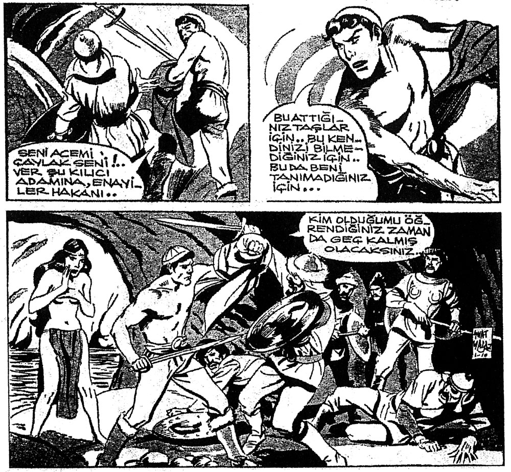 The story was about the hero Kaan, discovering his own identity, and his father Otsukarci on the way to Genghis Khan's treasures. Kaan was not afraid of anything, approaching even the most dangerous enemy with a sarcastic attitude. Suat Yalaz felt this was not credible, and made some adjustments to the script, much to the dislike of scriptwriter Kozanoglu. The collaboration soured, which coincided with the artist's military service. Aksam's publisher wanted the series to continue, and brought in Galip Bülkat to draw it. This was not a success, so Suat Yalaz came back to the feature upon his return to civilian life. Yalaz and Abdullah Ziya Kozanoglu worked out their differences, and from then on, the artist adapted the script summaries he had received from the scriptwriter to his own style. After the publication of nine new episodes between 1959 and 1961 the 'Kaan' series came to an end. Abdullah Ziya Kozanoglu decided to leave because of a disagreement with certain editors of the newspaper.