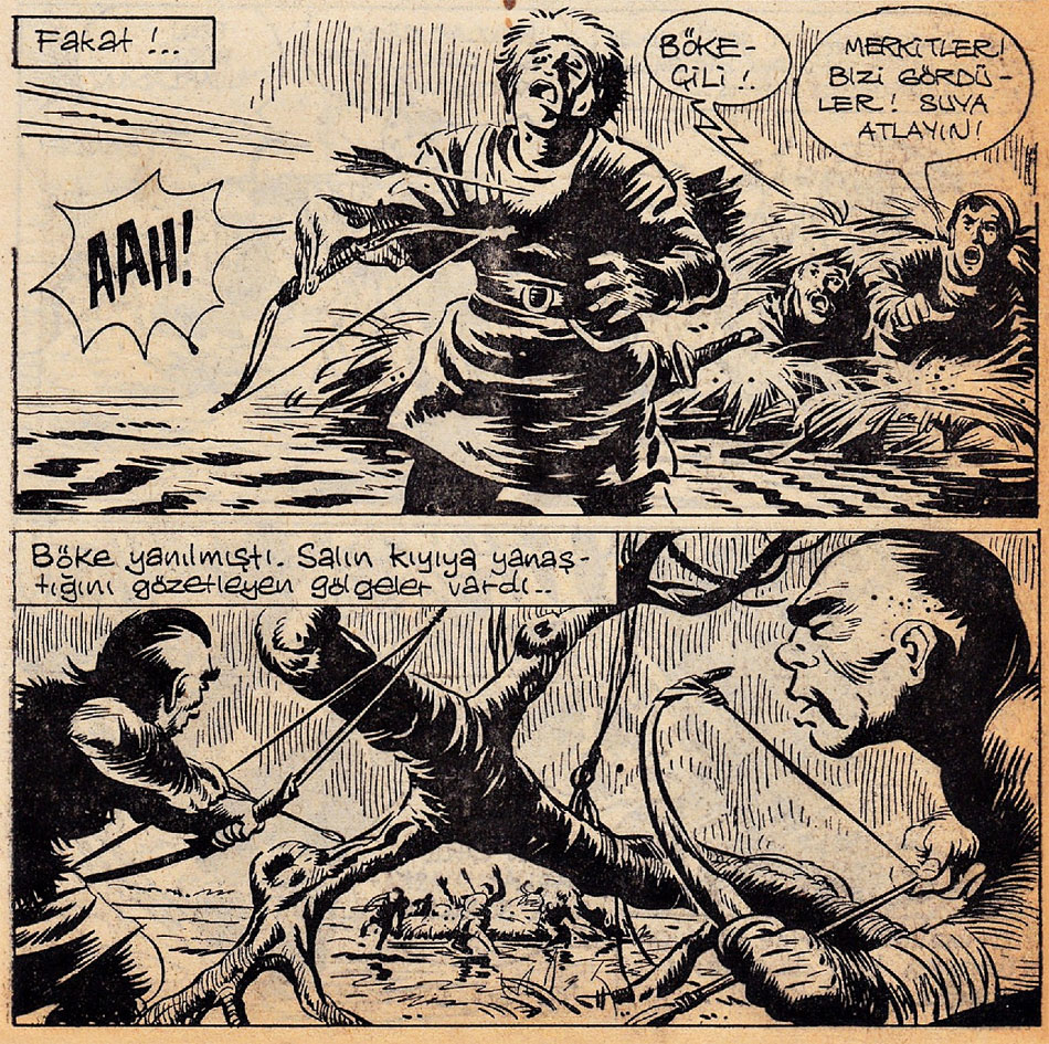 In 1959 Yalaz began his career-changing collaboration with the legendary Turkish writer, architect and entrepreneur Abdullah Ziya Kozanoglu. Kozanoglu was the author of the historically important Turkish novel 'Kiziltug', which was first serialized in the magazine Resimli Mecmua in 1925-1926 and then reprinted on several occasions. The novel was very important in Turkish literature and also the first historical adventure novel from the Turkish republican period. 'Kiziltug' tells the Turkish history of Central Asia in the first quarter of the 1200s, focusing on the importance of the Turkish Union while recounting the war between Genghis Khan and China. Since its release, it has acted as an inspiration and a catalyst for comics, literature and as a pioneer for Turkish films produced by Yesilçam Studios, recounting heroic figures in Turkish history. The novel has influenced not only generations of novelists and historical cartoonists, but politicians and intellectuals as well. In the late 1950s, Kozanoglu himself began writing comics serials set in this same time period, launching the historical comics genre in his country. At first he worked with Ratip Tahir Burak on 'Kirk Sehitler Kalesi' ("The Fort of 40 Martyrs"), and then with Suat Yalaz, with whom he adapted his original 'Kiziltug' book into the comic 'Kaan Cengiz Han'in Hazineleri' ("Kaan and the Treasures of Genghis Khan"). Serialization began in the newspaper Aksam on 19 August 1959.
