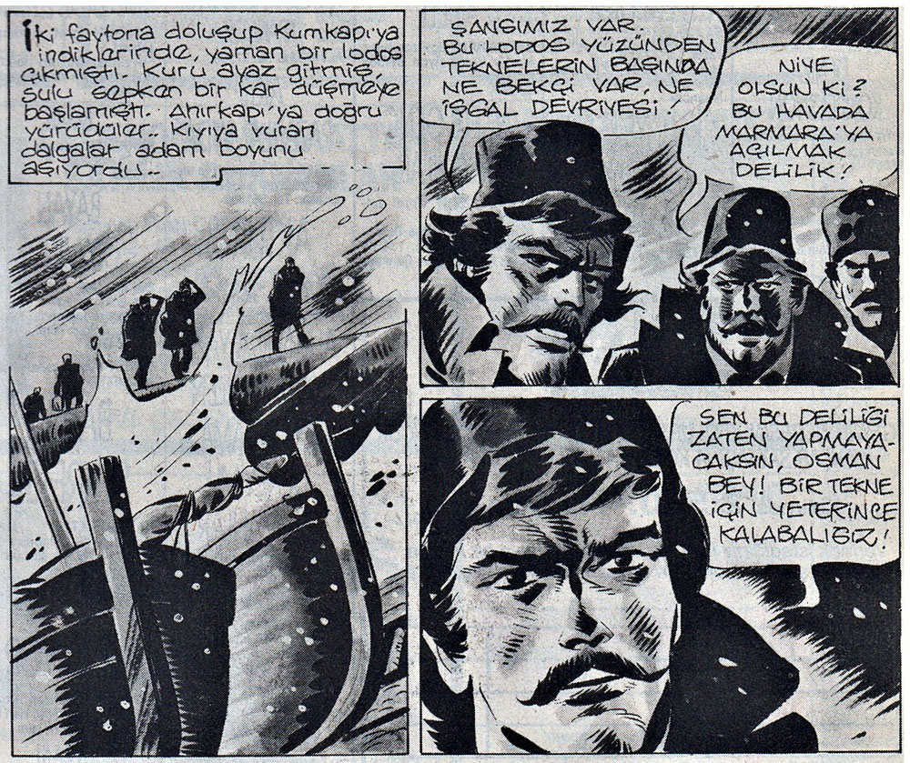 Yalaz, however, decided to continue the 'Kaan' series on his own, but under another name: 'Karaoglan' (literally "Black Boy", because of his long black hair). He also changed the names of the other characters. Kaan's father Otsukarci, for instance, became Baybora. Other important characters were Karaoglan's faithful companion Balaban, a former captain from the Mongolian army, and his nemesis, the Mongolian bandit Camoka. The first episode of 'Karaoglan' was published on 3 January 1962 in the Aksam newspaper. After a while, Yalaz wanted to stand on his own two feet and left the newspaper as well. His assistant at the time, Abdullah Turhan, was assigned to continue the serial, and he returned to the original name 'Kaan' for four episodes ('Kerayit Güzeli', 'Tung Hayin Öcü', 'Disi Panter' and 'Bizan'taki Yabanci'). Turhan transformed it into his own series 'Uzun Kiliçli Kahraman' ("The Hero With the Long Sword"), which later evolved into another classic Turkish adventure comic, 'Tolga' (1971).