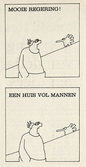 Early magazine cartoon from 24 December 1981. Translation: "What a fine government! A house filled with men, a few female aids and here and there a guard dog."