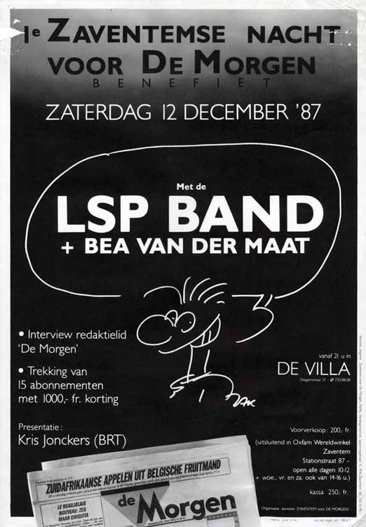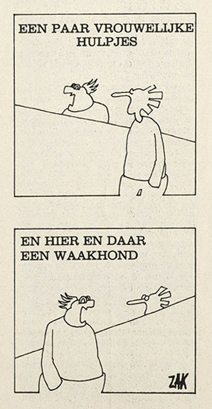 When magazine De Zwijger was cancelled in 1984, Johan Anthierens' brother Karel guided Zak to the left-wing newspaper De Morgen. In those early days, De Morgen was often understaffed. In case an issue lacked enough photographs, Zak was called in to make some additional cartoons. Some editions had five or more drawings by Zak instead of the usual one or two. When the newspaper was on the brink of bankruptcy, Zak designed posters for benefit performances to help it out of its financial troubles. Eventually, De Morgen managed to establish itself on the Belgian newspaper market, with Zak as its house cartoonist.