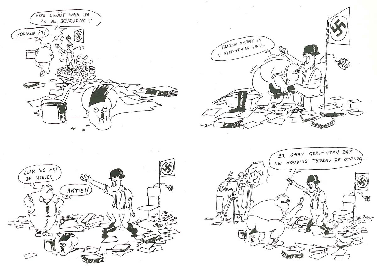 Sample from the book 'Brief Aan Een Postzegel' (1990). It shows a parody of journalist Maurice de Wilde questioning King Boudewijn/ Baudouin about his war past. He asks him "How big were you during the war?", whereupon the king raises his arm since he was indeed just a boy back then. This, of course, makes it look as if he is making a Hitler salute, especially when De Wilde dresses him up like a Nazi.